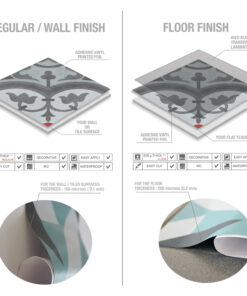 Choose the finish that works best for you: either our regular finish for walls, or our floor finish. Our wall tiles can be applied to a variety of smooth surfaces, including existing tiles and kitchen backsplashes. The floor tiles come with an extra protective layer that provides durability, scratch-resistance, and anti-slip properties for improved safety.