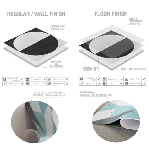Choose the finish that works best for you: either our regular finish for walls, or our floor finish. Our wall tiles can be applied to a variety of smooth surfaces, including existing tiles and kitchen backsplashes. The floor tiles come with an extra protective layer that provides durability, scratch-resistance, and anti-slip properties for improved safety.