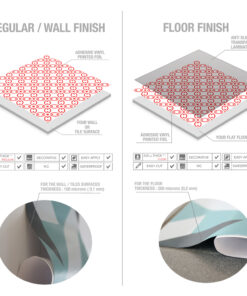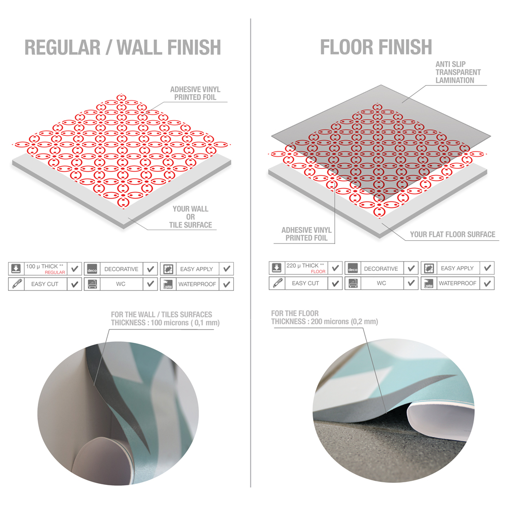Choose the finish that works best for you: either our regular finish for walls, or our floor finish. Our wall tiles can be applied to a variety of smooth surfaces, including existing tiles and kitchen backsplashes. The floor tiles come with an extra protective layer that provides durability, scratch-resistance, and anti-slip properties for improved safety.