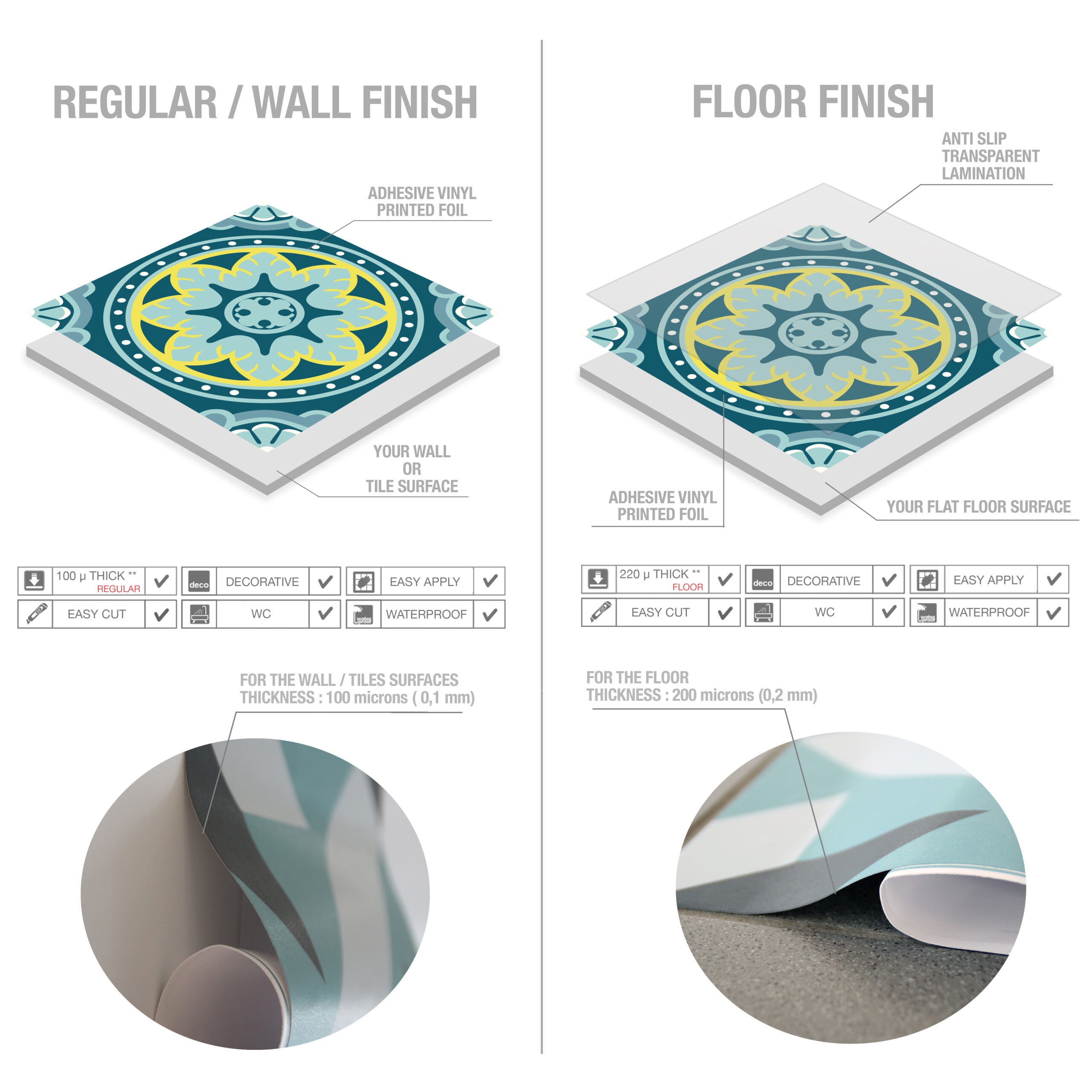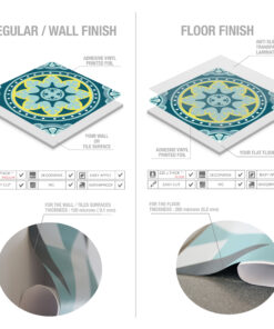 Choose the finish that works best for you: either our regular finish for walls, or our floor finish. Our wall tiles can be applied to a variety of smooth surfaces, including existing tiles and kitchen backsplashes. The floor tiles come with an extra protective layer that provides durability, scratch-resistance, and anti-slip properties for improved safety.