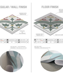 Choose the finish that works best for you: either our regular finish for walls, or our floor finish. Our wall tiles can be applied to a variety of smooth surfaces, including existing tiles and kitchen backsplashes. The floor tiles come with an extra protective layer that provides durability, scratch-resistance, and anti-slip properties for improved safety.