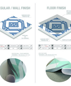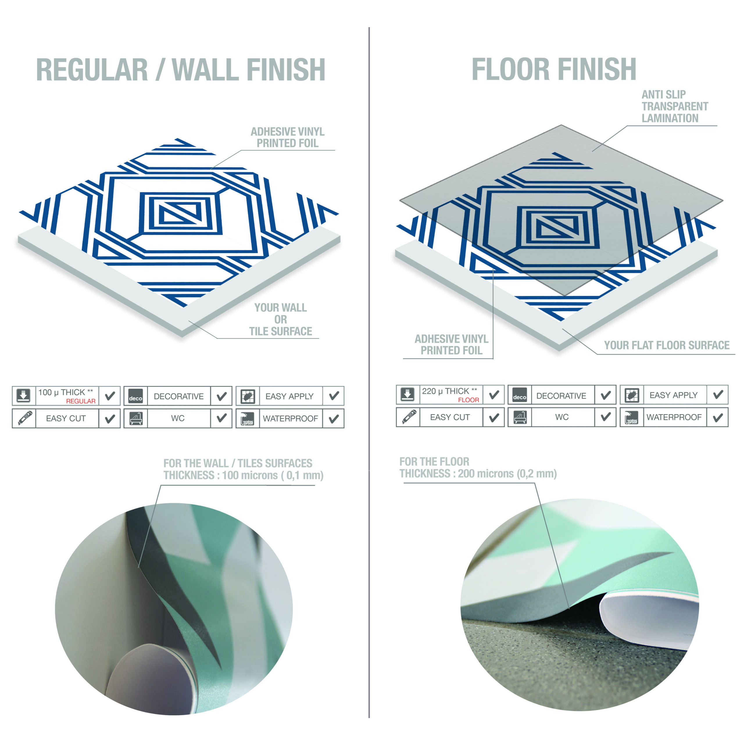 Choose the finish that works best for you: either our regular finish for walls, or our floor finish. Our wall tiles can be applied to a variety of smooth surfaces, including existing tiles and kitchen backsplashes. The floor tiles come with an extra protective layer that provides durability, scratch-resistance, and anti-slip properties for improved safety.