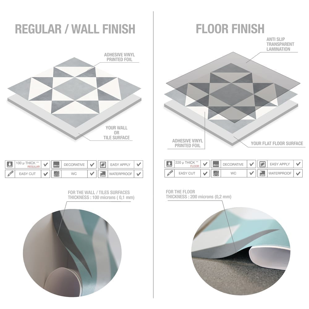 Choose the finish that works best for you: either our regular finish for walls, or our floor finish. Our wall tiles can be applied to a variety of smooth surfaces, including existing tiles and kitchen backsplashes. The floor tiles come with an extra protective layer that provides durability, scratch-resistance, and anti-slip properties for improved safety.
