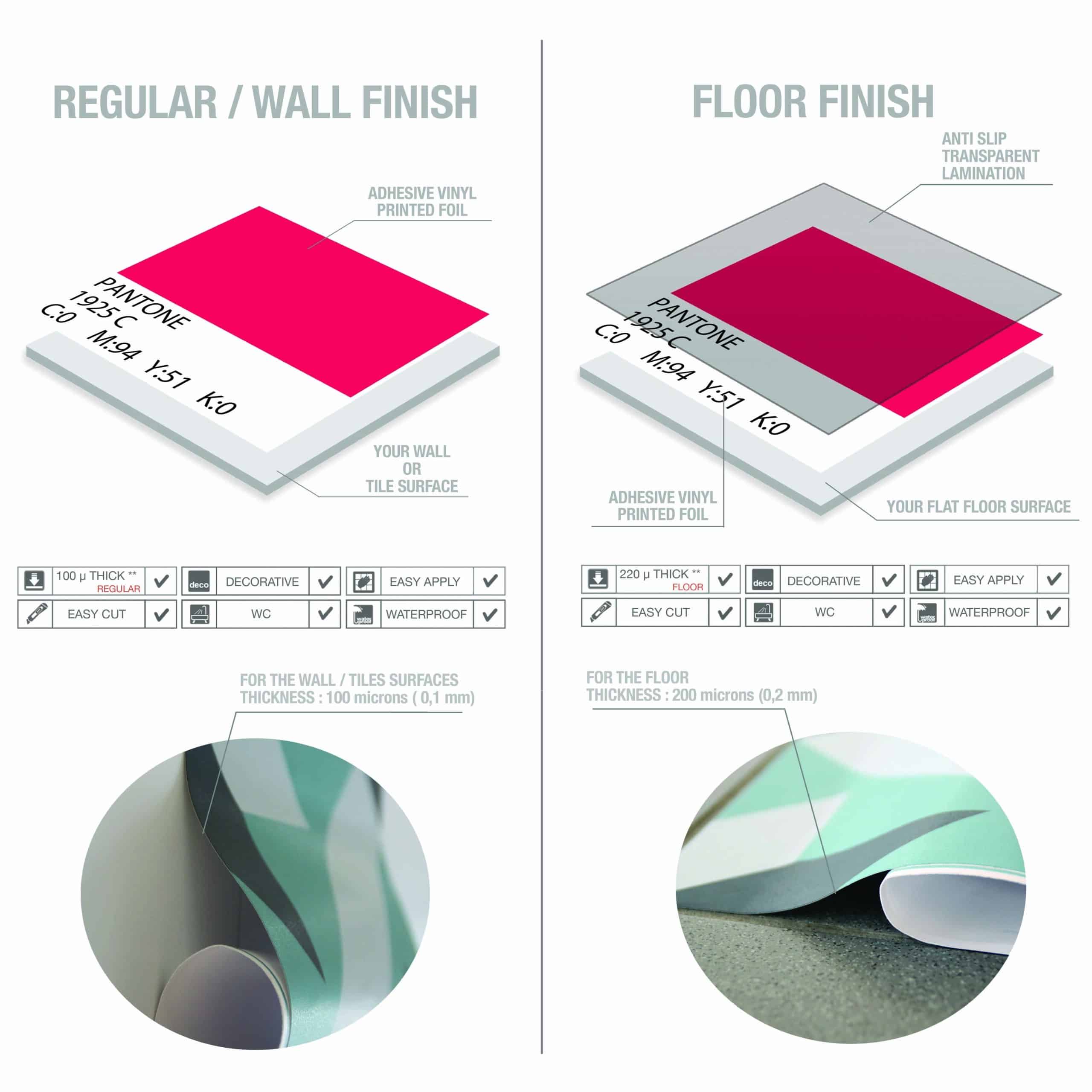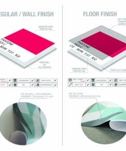 Choose the finish that works best for you: either our regular finish for walls, or our floor finish. Our wall tiles can be applied to a variety of smooth surfaces, including existing tiles and kitchen backsplashes. The floor tiles come with an extra protective layer that provides durability, scratch-resistance, and anti-slip properties for improved safety.