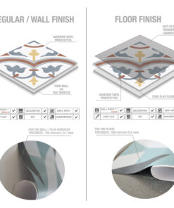 Choose the finish that works best for you: either our regular finish for walls, or our floor finish. Our wall tiles can be applied to a variety of smooth surfaces, including existing tiles and kitchen backsplashes. The floor tiles come with an extra protective layer that provides durability, scratch-resistance, and anti-slip properties for improved safety.