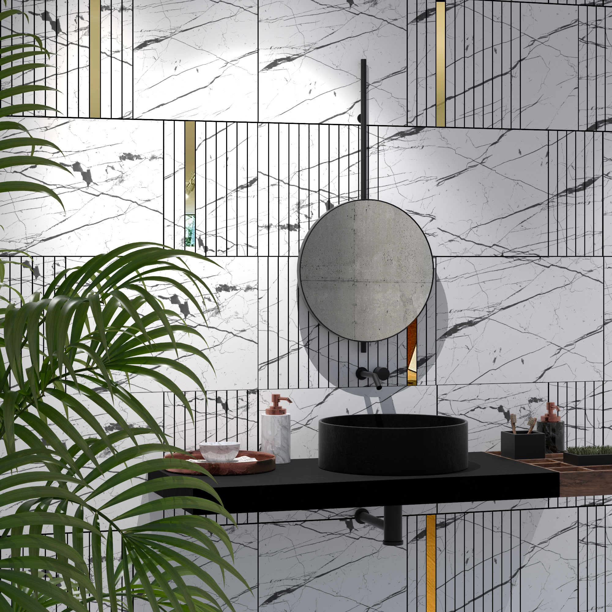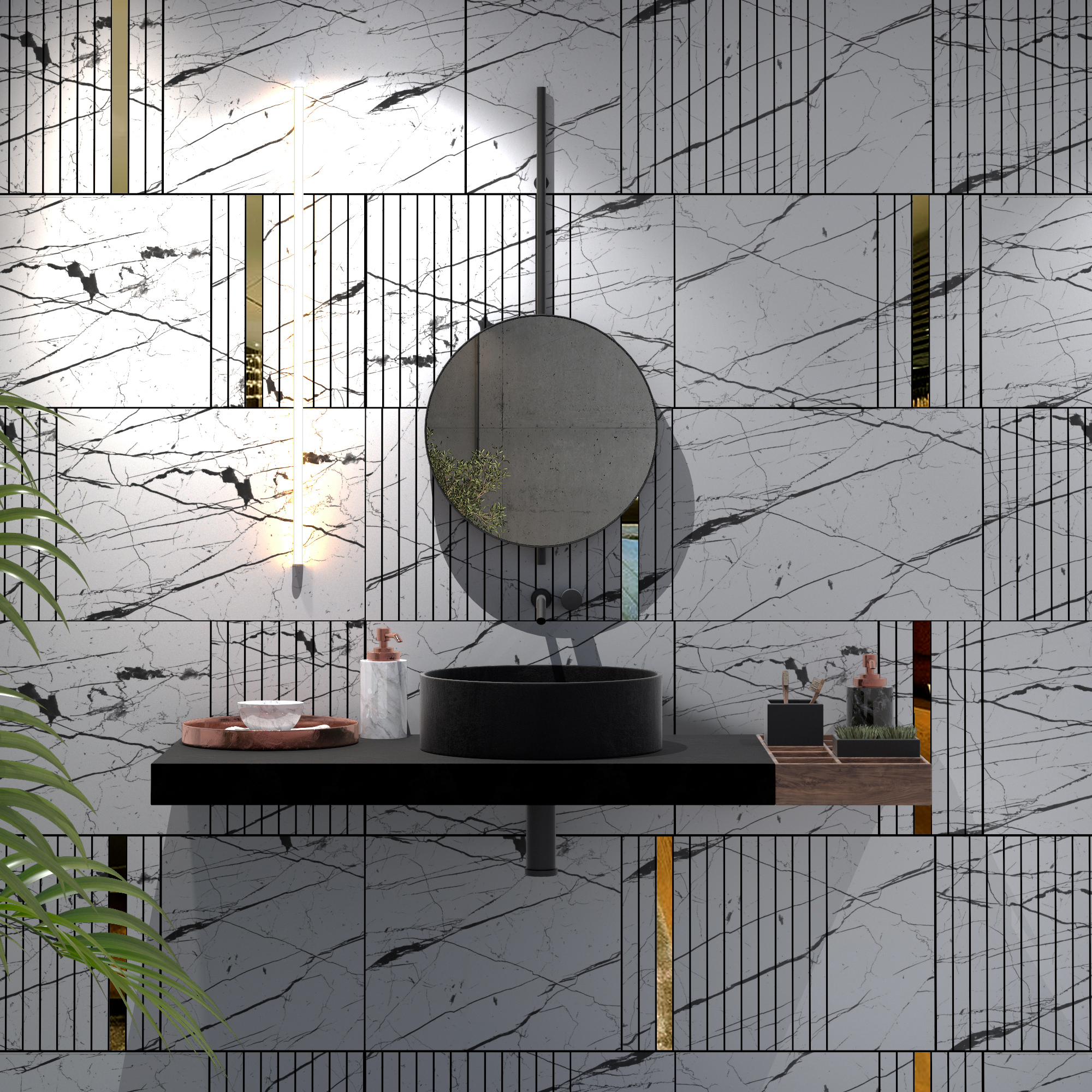 This product is made of 5 mm | 0.20 inches thickness black plastic with a layer of white marquina marble imitation and gold mirror.